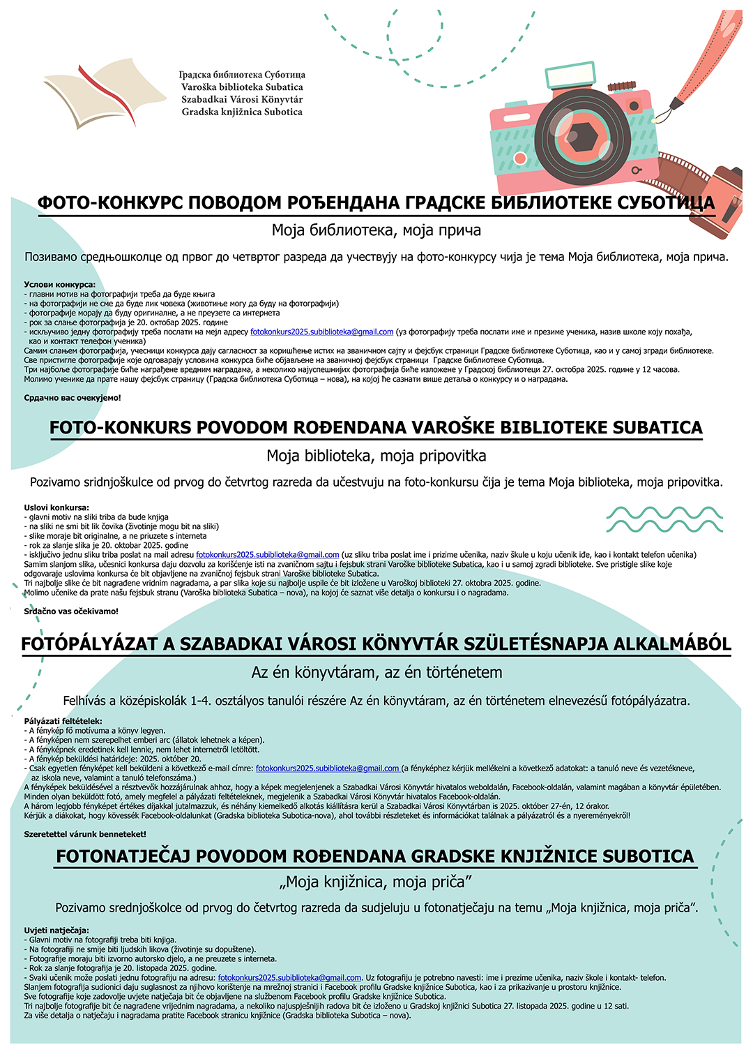 Градска библиотека Суботица позива средњошколце од првог до четвртог разреда да учествују на фото-конкурсу чија је тема Моја библиотека, моја прича