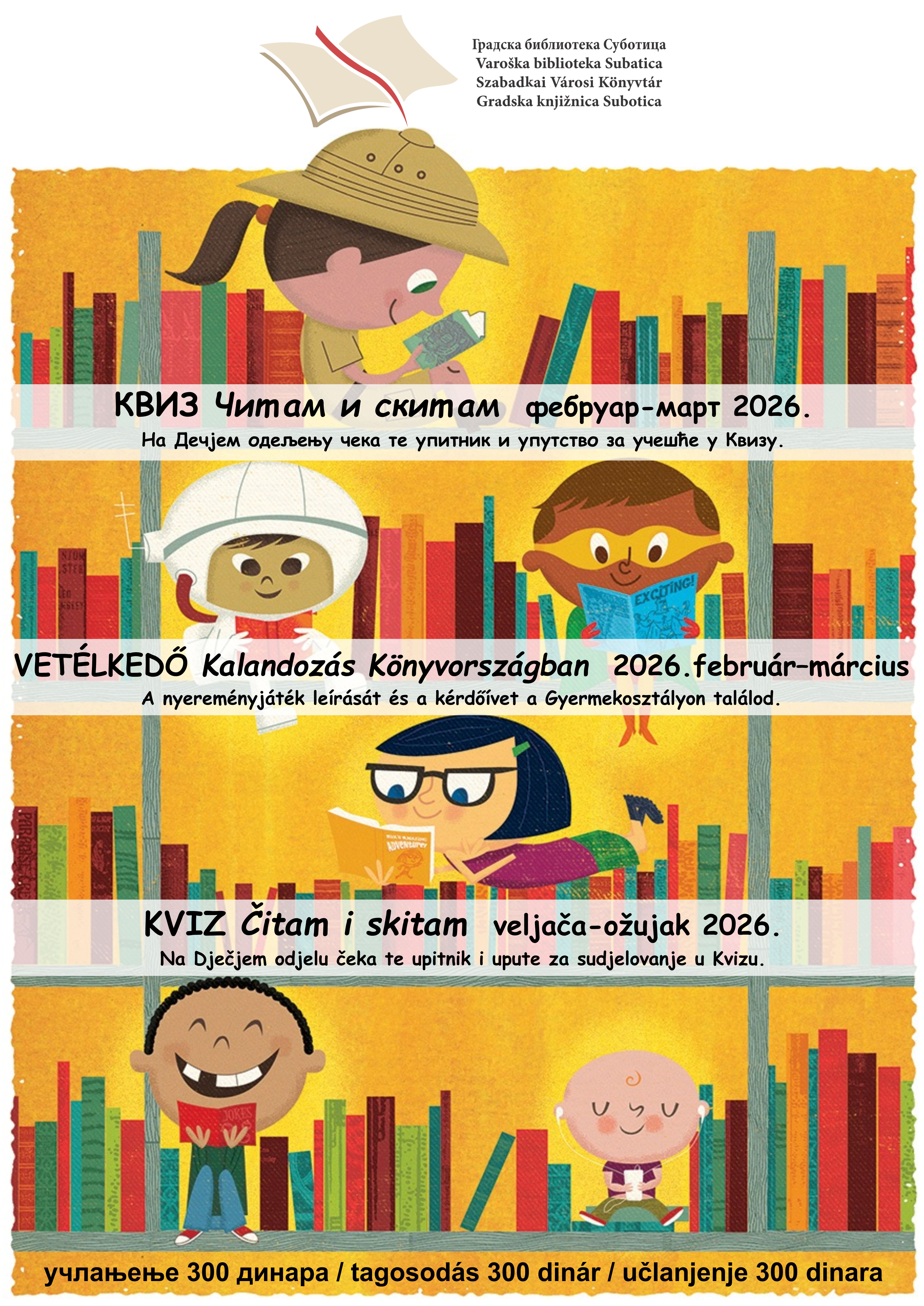 Kвиз за подстицање читања „Читам и скитам” је наградна игра Градске библиотеке Суботица намењена ученицима основних школа са подручја Града Суботице. Учествовање је индивидуално, а услов је чланство на Дечјем одељењу или неком од огранака. Током трајања Kвиза, у фебруару и марту, годишња чланарина снижена је на 300 динара. Упутство: • Kвиз је организован у фебруару и марту 2026. године. • Узрасне групе: - ученици од 1. до 4. разреда основне школе - ученици од 5. до 8. разреда основне школе • У Квизу могу учествовати чланови основношколског узраста Дечјег одељења или неког од огранака. • Током трајања Квиза годишња чланарина за ученике основних школа износи 300 динара. • За сваку узрасну групу припремљен је материјал за читање и упитник са задацима који се могу преузети на Дечјем одељењу Градске библиотеке Суботица или у огранцима. • Након што учесник прочита понуђене текстове, потребно је попунити упитник и предати га на Дечјем одељењу или у неком од огранака. • Рок за предају упитника је 31. март 2026. године. • Сви исправно попуњени упитници учествују у јавном извлачењу бројних награда које ће бити одржано 2. априла 2026. године, на Међународни дан књиге за децу. • Попис награђених ученика биће објављен у медијима, школама, на Дечјем одељењу, огранцима као и на сајту Градске библиотеке Суботица (subiblioteka.rs) и на Фејсбук профилу (Gradska biblioteka Subotica-nova). Желимо вам пуно успеха!